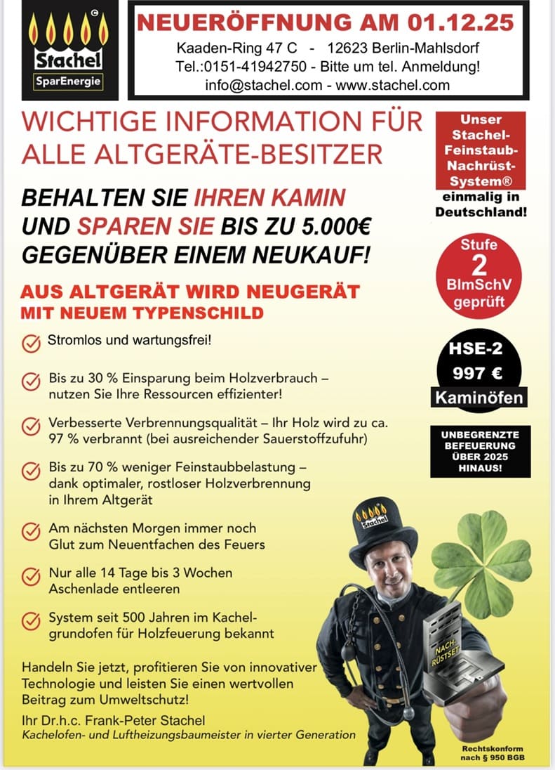 Führen Sie den Einbau selbst durch und erhalten Sie die Fachunternehmerbescheinigung für Ihren zuständigen Schornsteinfegermeister und Garantie durch Herrn Stachel, mit voller Wertigkeit wie beim professionellen Einbau.