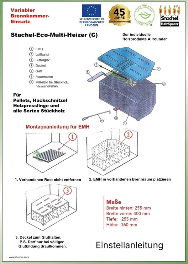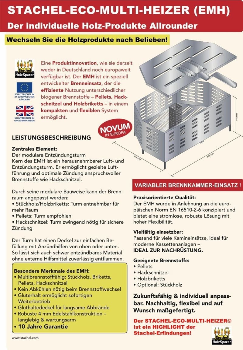 Der Stachel-Eco-Multi-Heizer© (EMH) ist ein innovativer Brennkammer-Einsatz für Kamineinsätze. Er ermöglicht die effiziente Nutzung verschiedener biogener Brennstoffe – Pellets, Hackschnitzel und Holzbriketts – in einem flexiblen System. Dank modularem Entzündungsturm lässt sich der Brennraum optimal anpassen und verschiedene Brennstoffe können ohne Abkühlphase gewechselt werden.