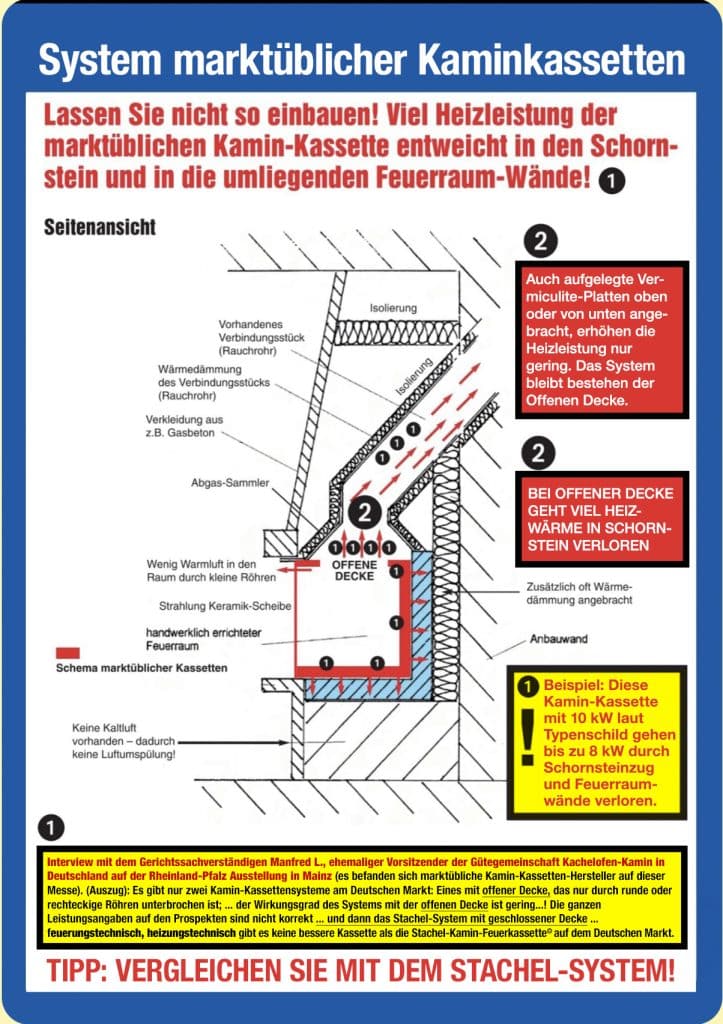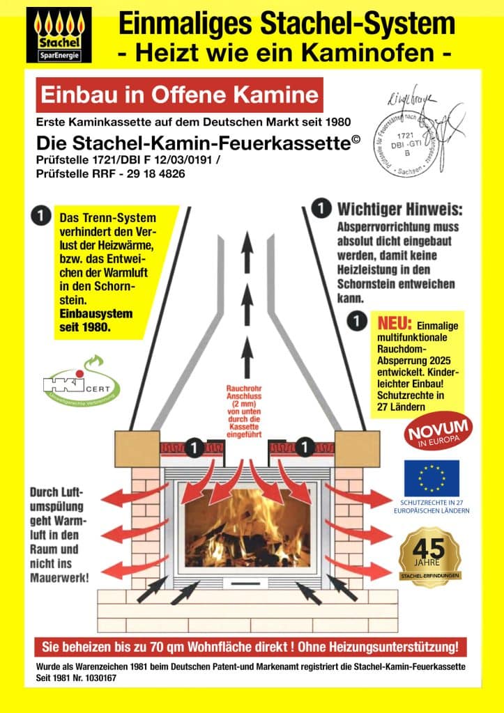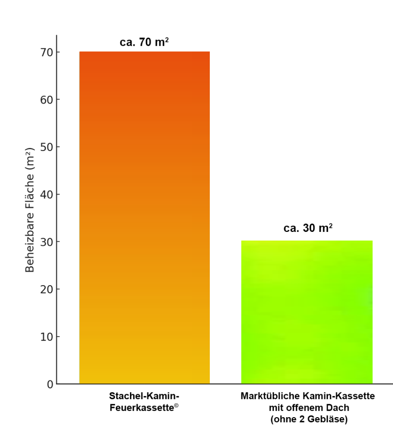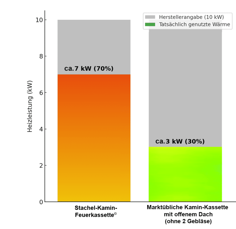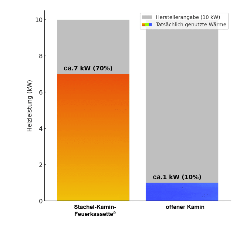 Stachel-Kamin-Feuerkassette© im Vergleich zu einem offenenen Kamin 7x wärmer, 4x weniger Holz
